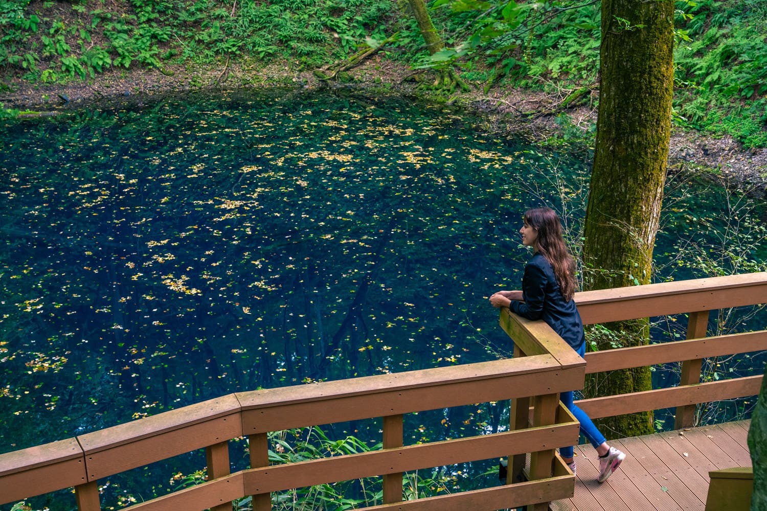 完全に自然が作り出した色味、青く輝く水面は、周囲の樹々を鏡のように映し出し、季節や時間帯、角度によって色合いが変わり、幻想的な雰囲気を醸し出しています。