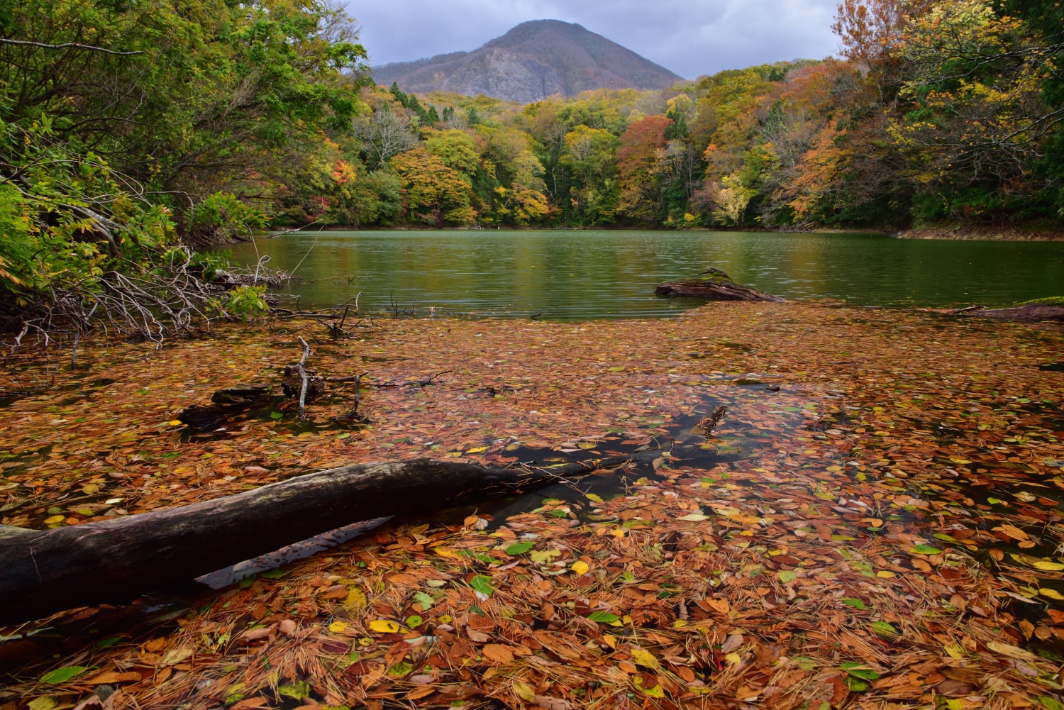 湖面と正面にそびえる崩山との景観は見応え十分。